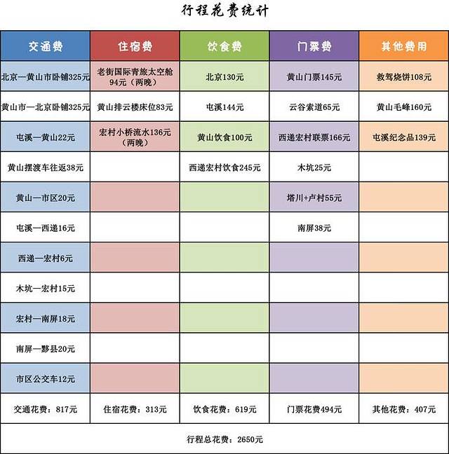 行程住宿分别在屯溪老街、黄山排云楼、以及宏村的小桥流水人家客栈三处地方。