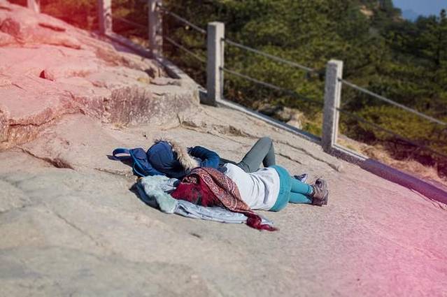 海拔1800米的日照还是很足的,看到一对游客躺在黄岗岩上晒太阳,用衣服遮挡全身避免晒黑吧。