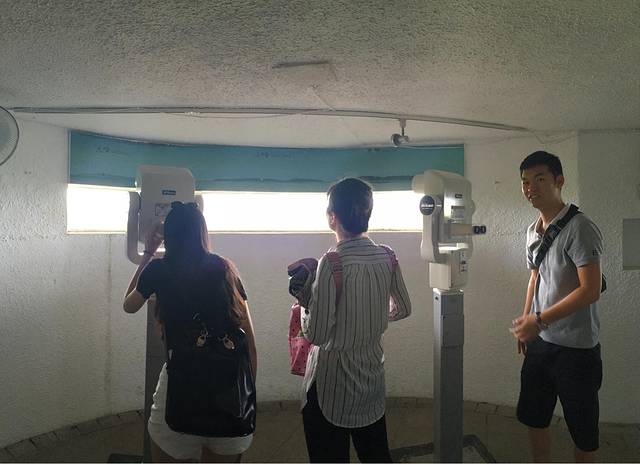 穿过数百米长的坑道,进入面海而筑的观测室,只见五台高倍望远镜弧形排开,大陆的“英雄三岛”角屿、小嶝、大嶝都清晰地尽收眼底。