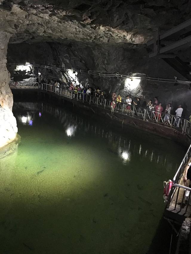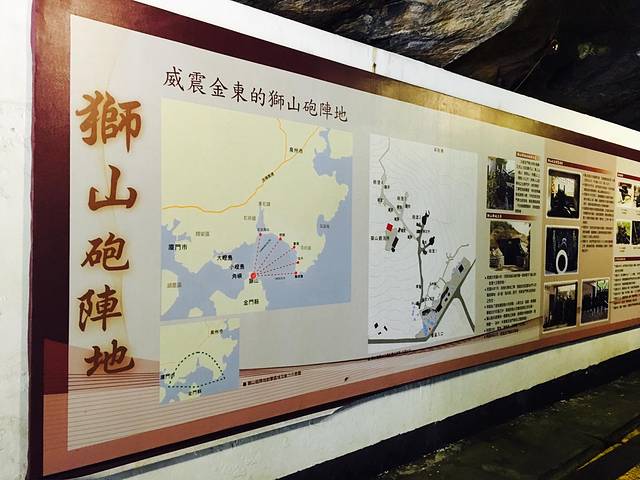 翟山坑道是我们游览的第一个景点,在金门县古岗村翟山腹部,1951年开挖,1955年竣工,皆由当年驻岛军人工一凿一斧开凿出来的,主要岩体是花岗岩。坑道分为坑道及水道两部份,全长约101公尺,宽约6公尺,高约3.5公尺,其中水道呈A字型,全长357公尺,宽约11.5公尺,高约8公尺,可容纳42艘小艇停舶。这个坑道,主要作用是供登陆的小艇回转及运补人员、物资用,因为这些耗费时间,若被我军炮火封锁的话,则而无法卸船。两岸局势缓和后,这个坑道的功能就消减了,后来被观光部门接管,1998年正式对外开放,成为金门著名战地观光景点。