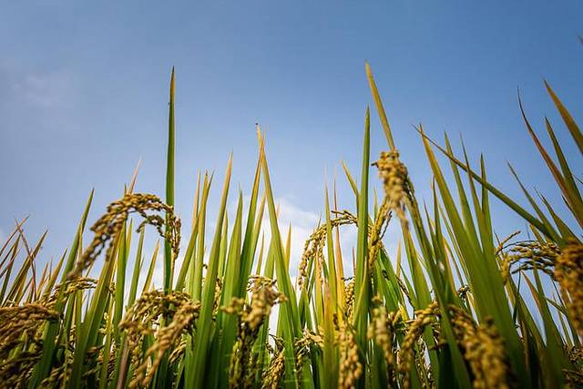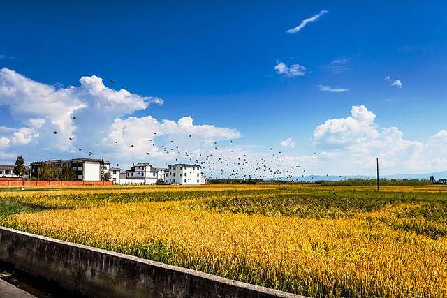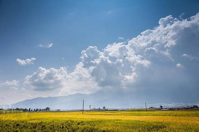 阳光很强烈,蓝天白云,灿黄一片,明媚耀眼