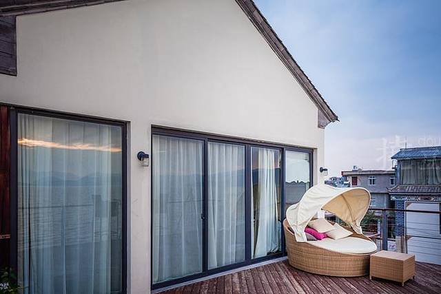 “隐仙”独自占据着整个顶层,开门便是一室惊艳。三面落地玻璃环绕着幔帐下的大床,一侧是贵妃榻,一侧是书和音乐,落地窗的一角竟然还奢侈的摆着浴缸,而这一切都恰恰浪漫的面朝着临水大露台,面朝着苍山洱海,面朝着太阳和月亮……