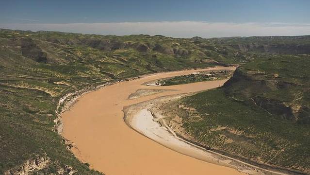 它形如太极阴阳鱼 ,环抱郁郁葱葱的青山。山上住着人家 ,炊烟袅袅。岸边的草滩上, 一 群黄牛正在河边饮水。乾坤湾不仅壮美 ,还是一幅黄土高原的生活图画 。