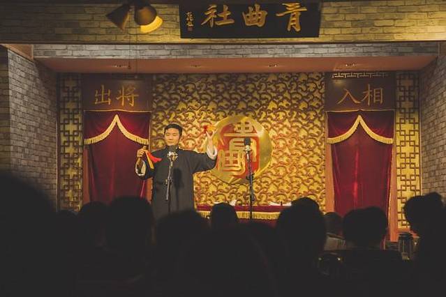 青曲社的名称蕴含“青云直上,曲故情长”的意思。走进门后有许多小方桌围着几个靠背凳子,大家统一面对舞台,一遍喝茶一边嗑瓜子的听相声。