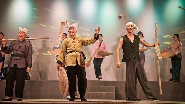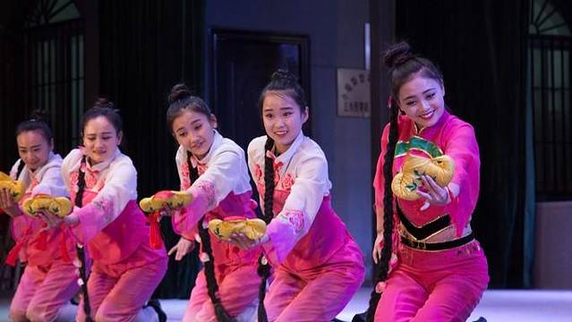 这是什么参加过国内重要表演的一个节目,貌似是给外国首相表演过的节目,大概的意思是表现出在丰收季节,陕北大地开始打谷晒谷的热闹场景。