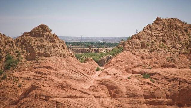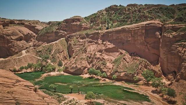 在两边都是红色的石头中间有一片绿洲。