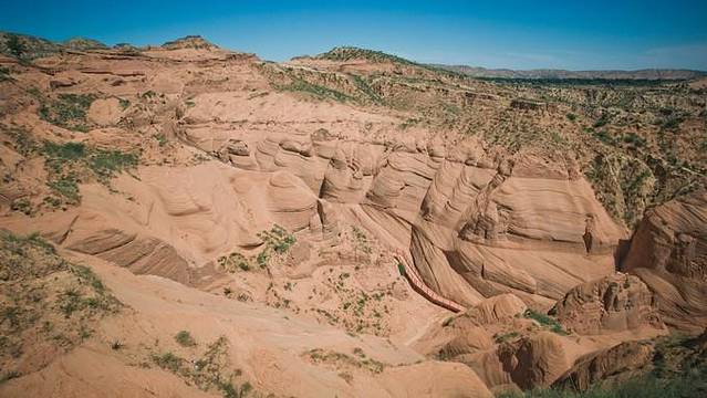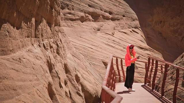 波浪谷被称为中国的羚羊谷。靖边波浪谷虽然没有亚利桑那州的波浪谷大,但在陕北这个黄土覆盖的地方能有这样的石头景观真是个奇迹了。靖边"波浪谷"这一名称是来这里的摄影者给予的,它与亚利桑那州的波浪谷是有一定区别,亚利桑那州的波浪谷在红色之间夹有白色线条,红白相间;而靖边的波浪谷则以红色为主