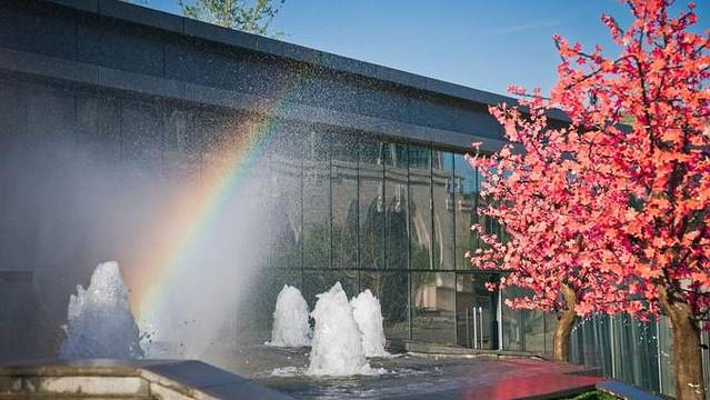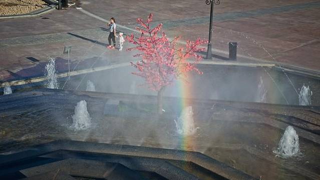 从枣园文化广场往下走,可以看到喷泉,而喷泉喷出的水花在阳光的照射下形成了彩虹,看到这些七彩的东西心情十分愉悦。