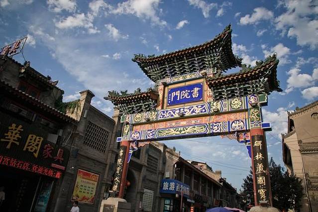 书院门位于古城南城门(永宁门)东侧,西面连着南大街,向东的尽头靠近碑林博物馆。古色古色的街道旁,处处都是字画店铺和经营文房四宝的小店。 街道两旁是青一色仿古建筑,脚下是青石板铺路,处处都是高大的槐树。只有五百多米的街道上,集中了上百家店铺,销售着全国各大旅游景点都在卖的“纪念品”。