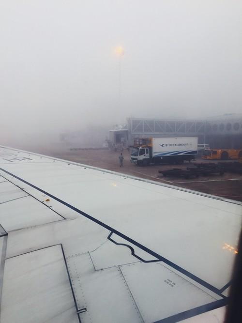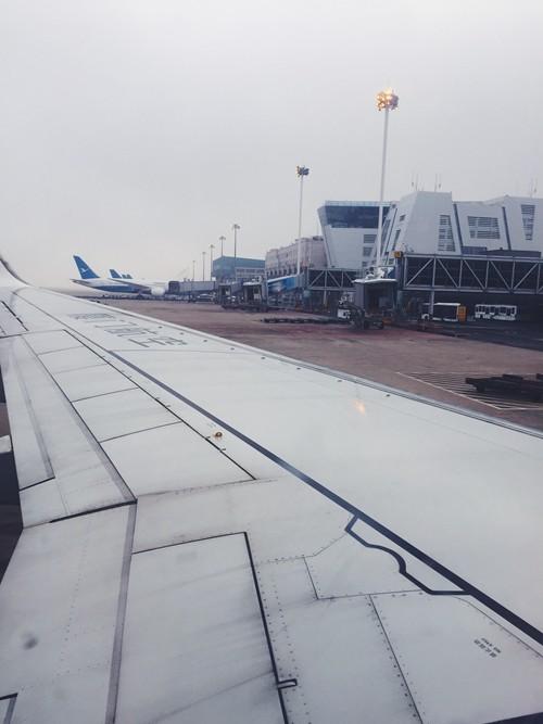 拿到机票坐在候机厅等待时间的度过,可惜天公不作美,我们一遍一遍地听到广播发出抱歉的通知,无奈因为大雾一直未散去,我们的飞机delay了五小时才启程。