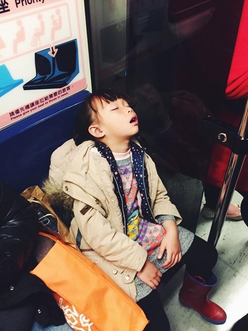 再回到台北车站捷运站已是真正要告别此地了,提着行李前往机场的我们也想像此小孩一样睡得如此安沉,回到amoy的大床吧