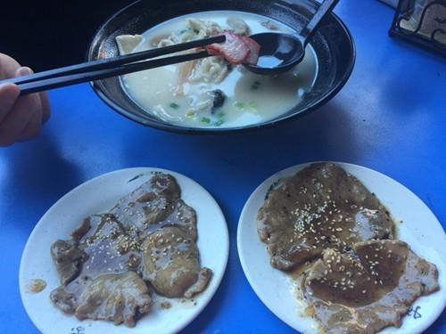 白切鸡:鸡皮很滑,鸡肉鲜嫩,皮肉之间有肉冻,可以品尝原汁原味,也可以蘸上台湾的酱油膏(他们的酱料似乎都偏甜)