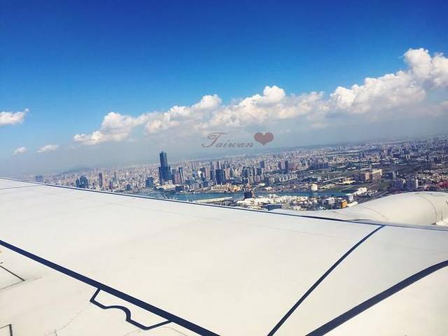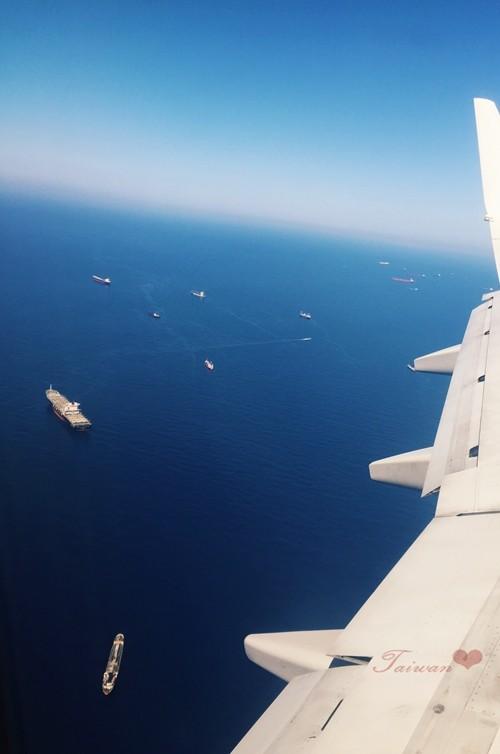 飞机还未抵达高雄港的时候先是从窗口望见汪洋湛蓝大海中的一个小白点,再靠近海面一些才感受到众多船只的既视感,湛蓝海天之中仅隔着倒影般的白色界限,高雄港的繁忙程度也可见一斑吧。