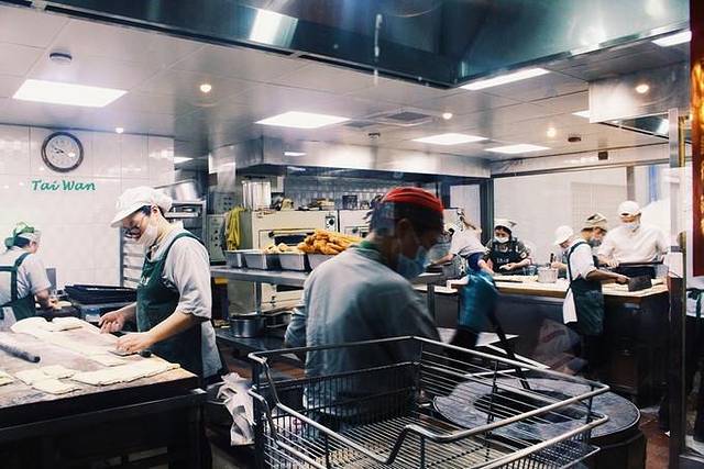 队伍流动到二楼就可以透过玻璃看到工作人员制作的全过程,他们从一大早就忙个不停各司其职。我听说台北传统模样的豆浆店不少,而店内的早点最平凡也最传统的风味便是豆浆搭配烧饼油条,坦白说记得之前有一次特意想回味古早味,吃了一回类似这样的早餐,结果油腻得坦言不会再回味了。