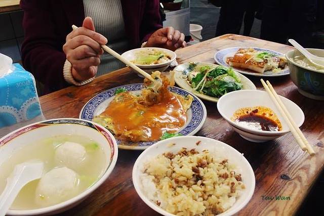 点的都是台湾小吃,肉燥饭:拌着肉沫呼啦呼啦地扒着几口就解决,看康熙美食单元经常听资深饕客这样解决一碗肉燥饭,一小碗饭拌着肉沫不自觉就吃完了,口感依旧偏甜。蚵仔煎:坦白说没吃到几个海蛎,大多是面粉糊成一团,口味偏甜了,还是喜欢吃妈妈做的正宗厦门海蛎煎。萝卜糕:没有吃到萝卜的绵密感,可能是因为尝过了潮福城的做法,其他地方的口感就难以入眼了。
