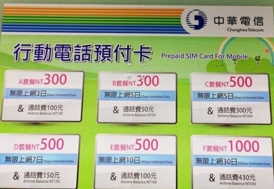 (1)手机卡:台湾的通讯工具有三种:台湾大哥大、中华电信和远传电信,由于中华电信的信号会强于另两者且考虑到行程可能会进入较为偏远的地方,于是选择了中华电信。下了飞机出关后到大厅就可看到中华电信的招牌啦,套餐的费用见下图,我办理的是D无限上网七日+150NT的通话费,换完卡号要记得重新开机才可生效!