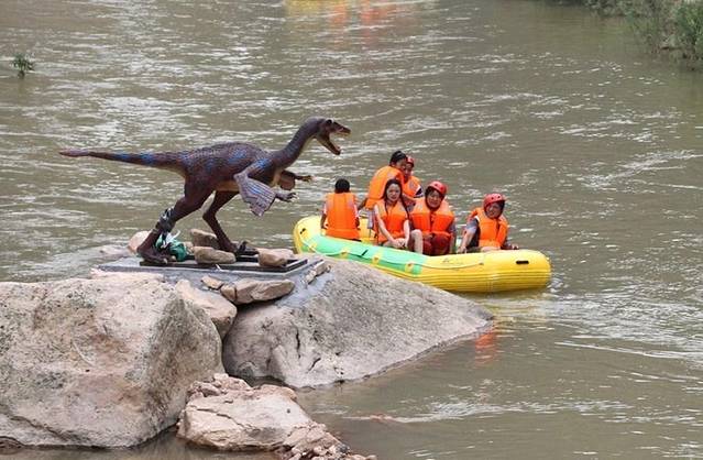 我们刚进去,看到的一个大招牌“恐龙谷漂流”,旁边竟然还有那么逼真的大恐龙立在门口两侧,像是在欢迎我们一样,顿时我的思绪就不再放在主播小帅哥身上了,就放肆的玩一场吧!整个山谷里,都回荡着快乐的氛围,原来快乐真的会被传染。那傻子会不会传染呢?