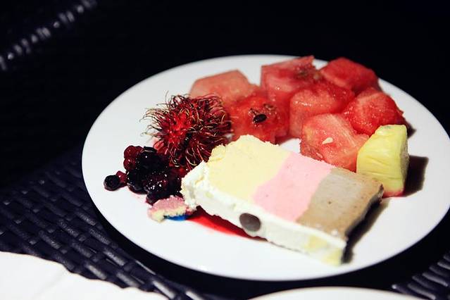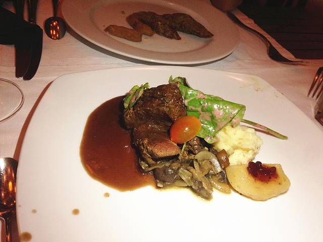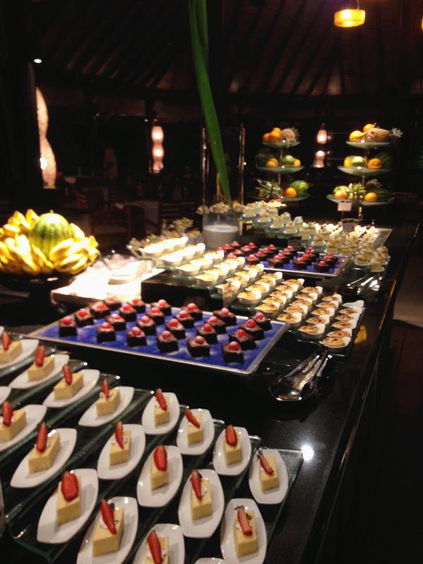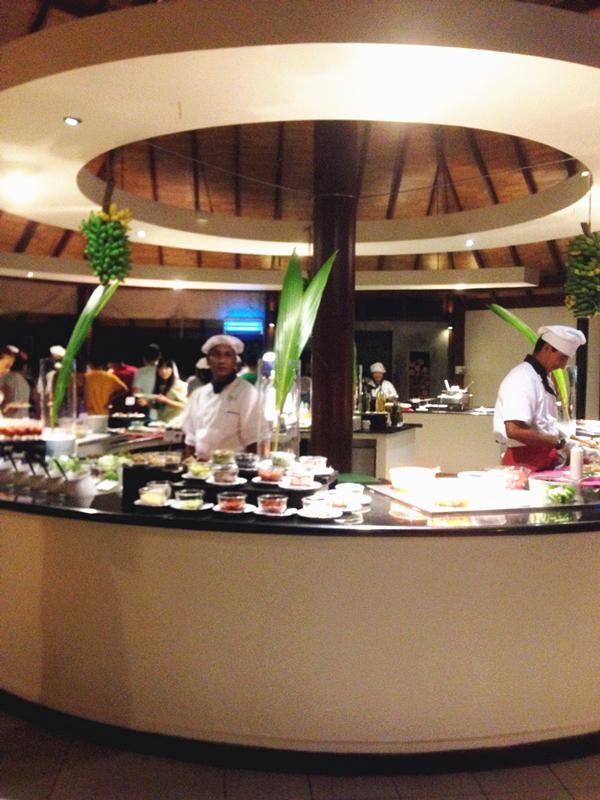 酒店三餐是和房费一起全包预定的,有两个餐厅,包三餐的就是在主餐厅(main restaurant)享用三餐自助了,当然你也可以自费在鱼点菜(fish a la carte)单点用餐,单点餐有99美元每人的龙虾套餐或者日式火锅可选,要是很懒的话,叫送餐服务到房内也可以。自助餐就很丰富了,西式,每件都很精致,每周还有一次晚上不是自助,是五道菜。你可以在室外吹着海风用餐,也可以选择室内,室内也是敞开式的,你刚落座,工作人员就会很热情的问你想喝点什么,除了酒是收费的,汽水及果汁是免费的呢。工作人员撤餐盘也很积极。夜晚伴着小烛光用餐,也是种很好的享受。