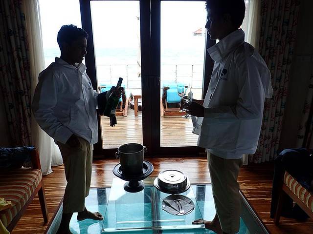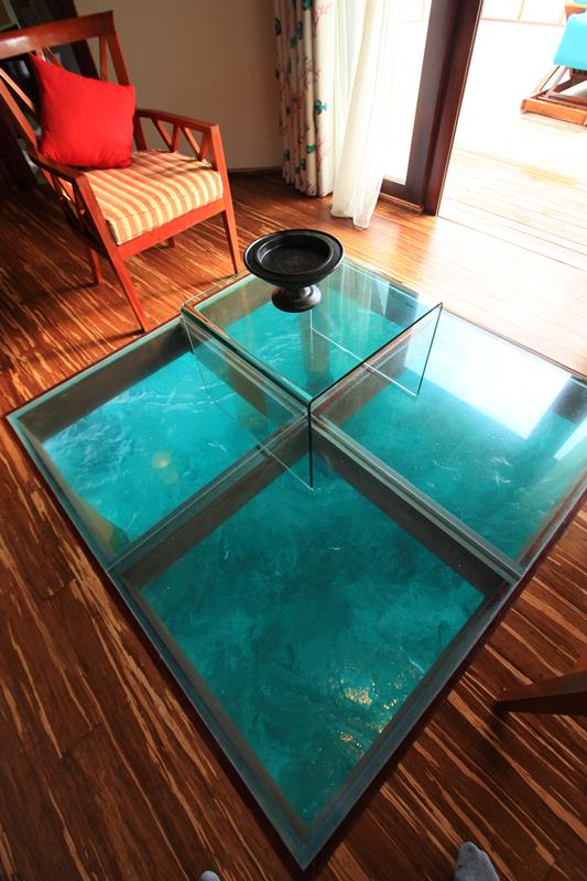 一进水屋,美呆了,水屋很大,屋内的色调给人以温馨舒适的感觉。2米的大床很适合度蜜月的人,床品也很舒适,室内空调温度也很适宜。小黑朋友送来了蜜月水果和香槟,不过住这些天都没有铺蜜月花床,上岛这天天气也不太好,头两天水屋晚上睡觉时外头狂风暴雨,不过还是不影响我的好心情。客厅有块玻璃地板可以观看水下,夜晚点亮灯时还会有很多小鱼游过来。