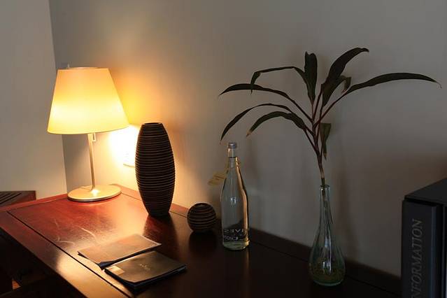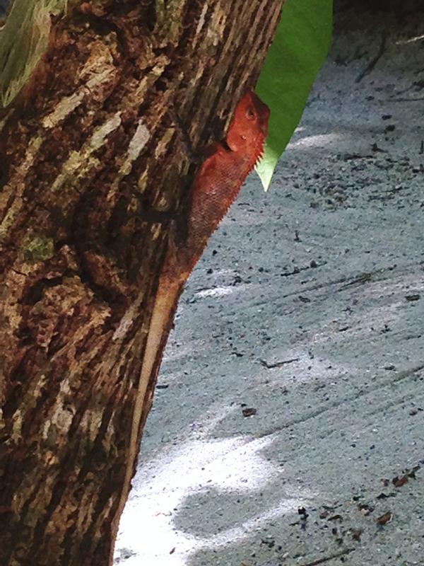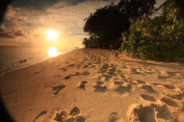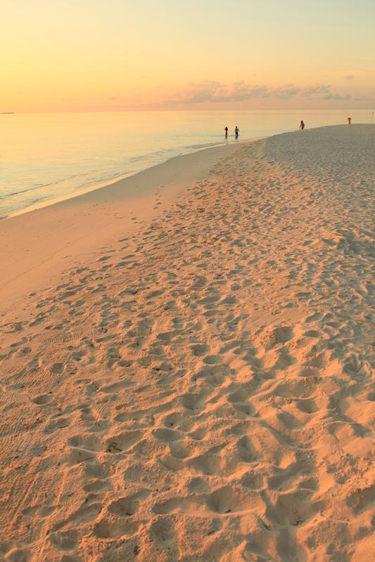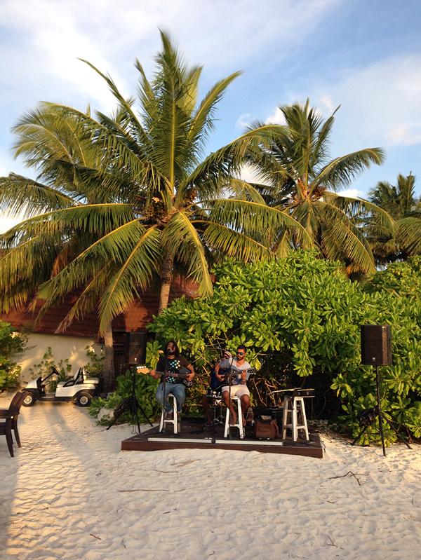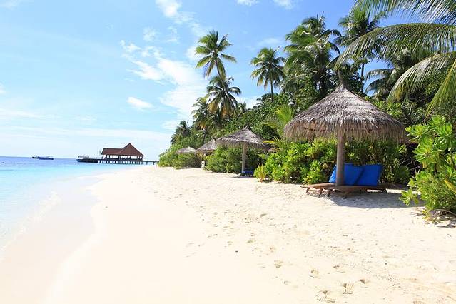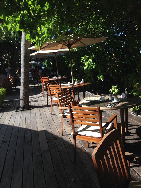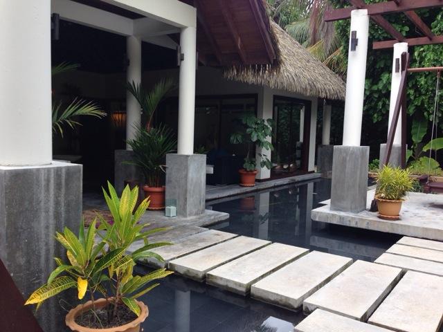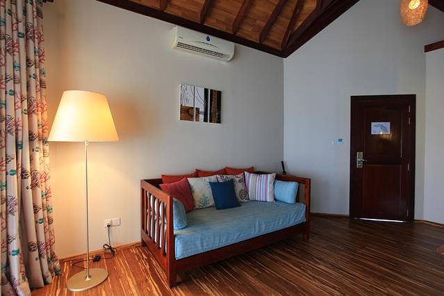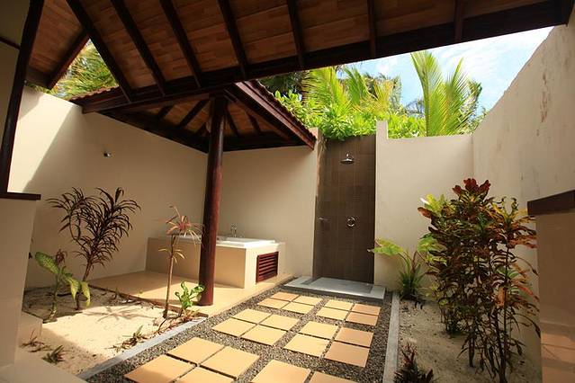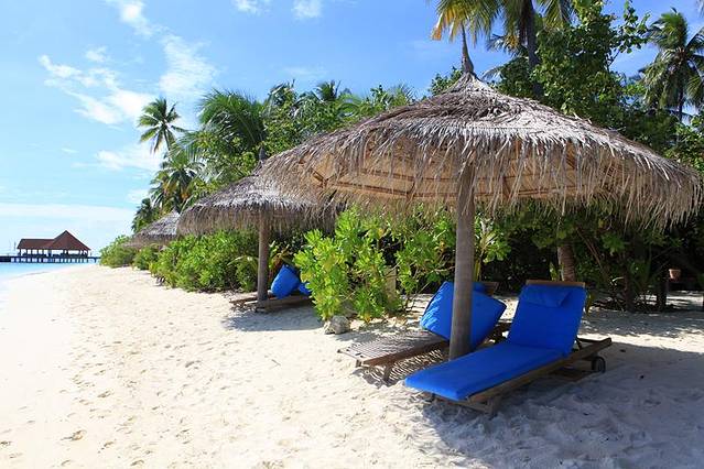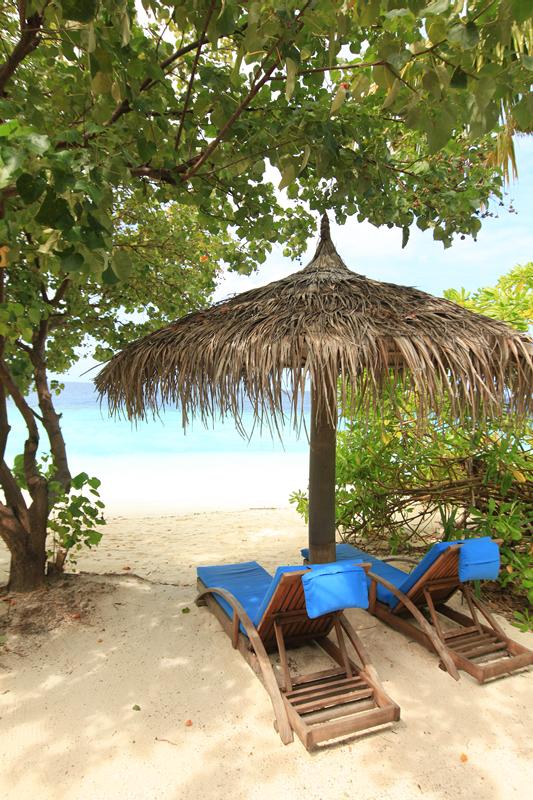 今天换到沙屋了。沙屋有三种,花园别墅(Garden Villa)、海滩平房(Beach Bungalow)和海滩别墅(Beach Villa)。我这次入住了第二种,第一种在岛的中心地带,看花园景色,后两种是在海边,自家露台出来六七步就是海,内部结构都相差无几,从一到三价格依次贵些。第二种出门就是最适合浮潜的地方,离餐厅、酒吧、日落沙滩最近,性价比最高。房内依然是棕色和蓝色调,温馨舒适。房屋摆设与水屋相同,不同的是厕所是露天的,洗澡时吹着风很凉爽,又不会担心私密性不好。每个房间露台出去,还都有自家独用的沙滩躺椅。