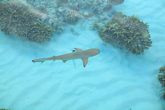 水屋下的水很清,在屋外栈道下就能看到这里常见的小柠檬鲨,俗称Baby Shark。