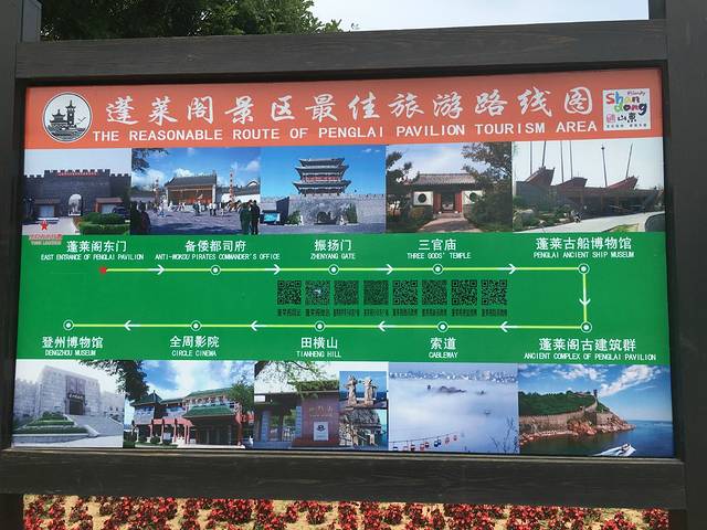 到达蓬莱已是晚上9点。这趟车从进蓬莱以后就不断有人下车,走走停停特别墨迹。我们定了尚客优连锁酒店汽车站店。第二天直接到了蓬莱阁。广泛说起来蓬莱阁景区特别大,主要的部分有两个,一个是蓬莱阁古建筑群,另一个是田横山景区。全票价是140元,学生半票,网上优惠价格125元,在旅行社、宾馆酒店甚至在景区周边的一个小贩手上随便都能拿到120元的更优惠票价。