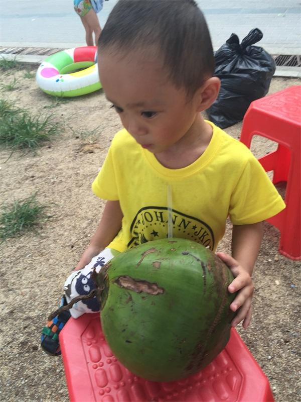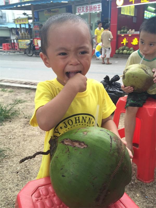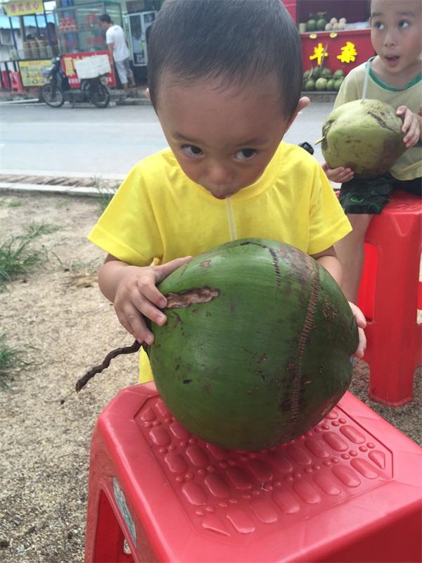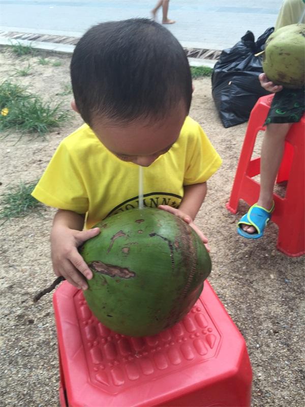 日落西山,孩子们弄得满身海水泥沙,纷纷叫饿,于是打道回客栈,小王子第一次喝椰汁,满口不适应。