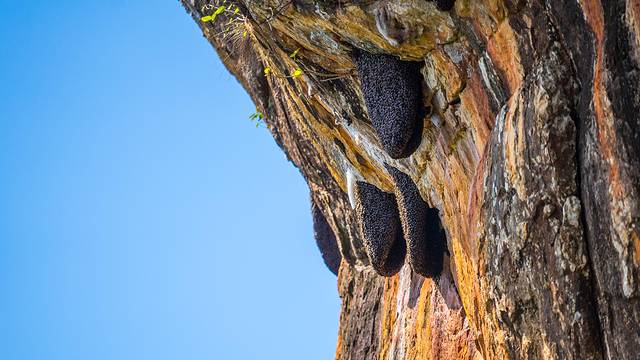 来,猜猜,悬崖上挂的这是啥?猜不出来就看下面那图,对于这种崖蜜的所在我熟得不能再熟了,年初在云南的大山里我被坑过一次,和它们做过一次亲密的接触,手上脸上挂满了蜂刺和肠子回来的,等有空了把那次经历写一下。