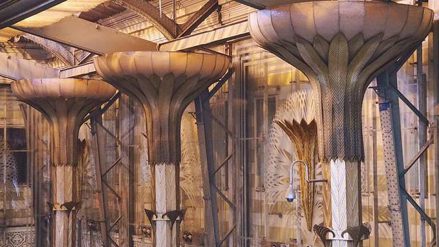 灯光点亮后,巨型廊柱上的雕刻清晰可见。