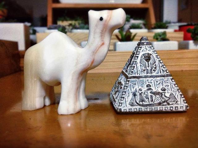 图中的骆驼和金字塔石雕购于阿斯旺市集,每个5埃镑。