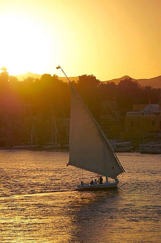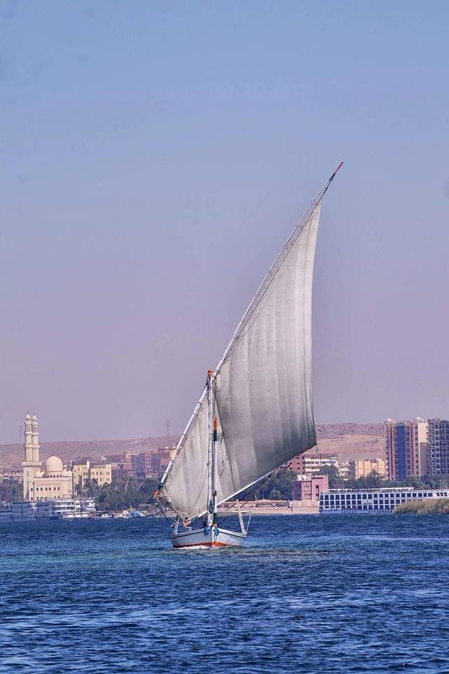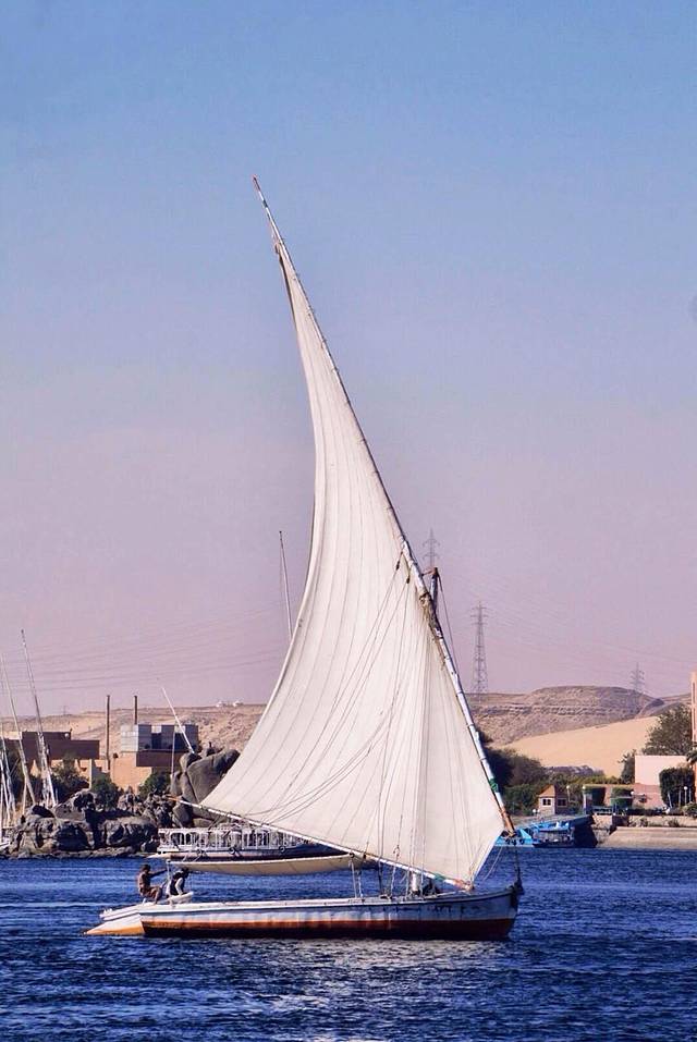 扬起由帆布制成的三角帆,远望去,风帆在湛蓝的尼罗河上轻快的滑行,如同一只贴着河面上飞行的巨大水鸟,赏心悦目。