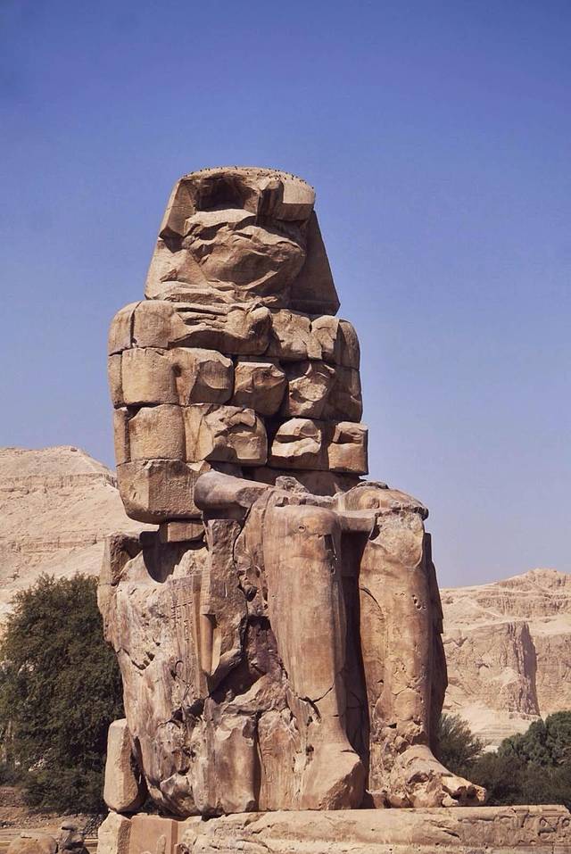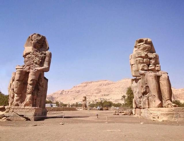 【哭泣的门农神像】门农神像位于离哈特谢普苏特神庙不远处的一块空地上。这两尊高达18米的神像,如今面部已严重破损,孤独的矗立在田野间,静观着这变幻莫测的世界。