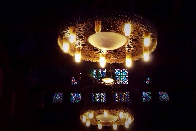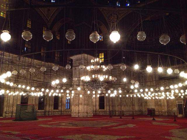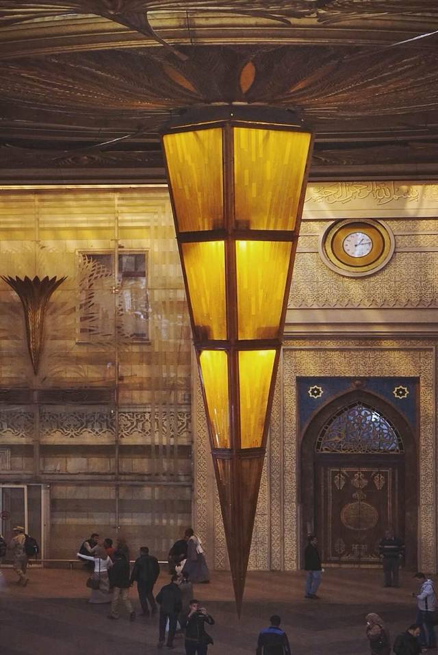 高达10多米的吊顶,塔型水晶吊灯,以其为中心围绕排列着小的圆形玻璃灯,配以鲜红的麦加地毯,即使没有信仰,也会折服于它的静穆与沉静之美。