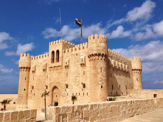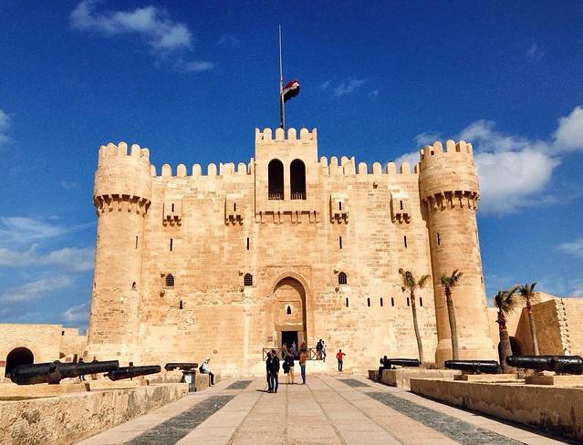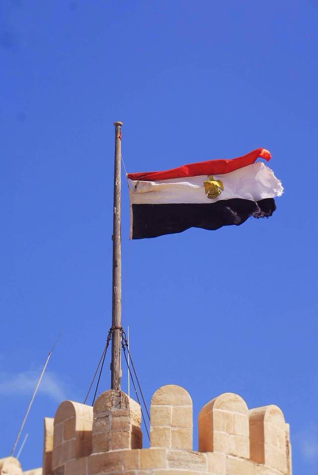 城堡上飘扬的埃及国旗,映衬着蓝天甚是