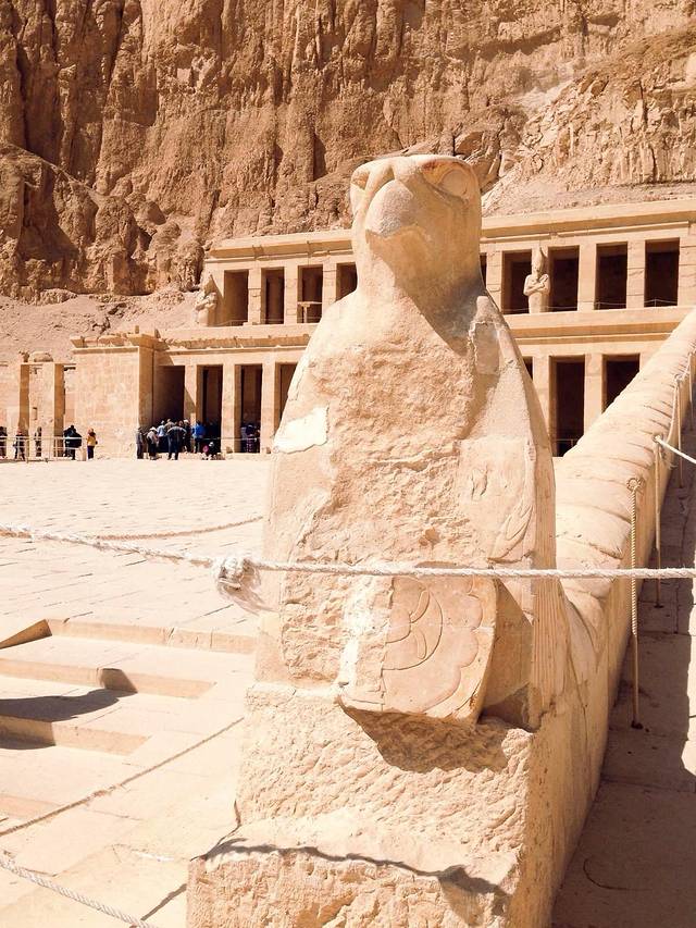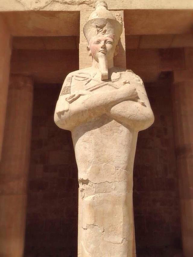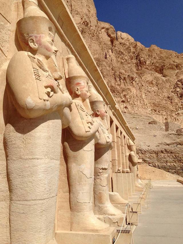 哈特谢普苏特是古埃及唯一的女法老,类似于中国的武则天,但这座神庙里她的雕像和其他法老王一样,是按男人的形象塑造的,双手交叉于胸前,带着王冠,还留有胡须,这是女王意图告知世人,她和男人同样智慧,同样强大。