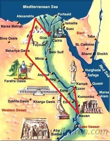 尼罗河发源于非洲西部的高地,它从南向北奔流而下,穿越过金色的撒哈拉沙漠,经过湍急的瀑布后,缓缓进入一条狭窄的河谷,一路浩浩荡荡流向地中海,贯穿埃及全境。在临近入海口的地方,尼罗河分出多条支流,形成扇状,冲出一片土壤肥沃绿草如茵的河谷三角洲,这片神奇的土地曾经孕育出震惊世人的古埃及文明。