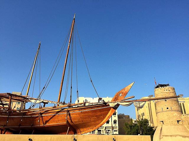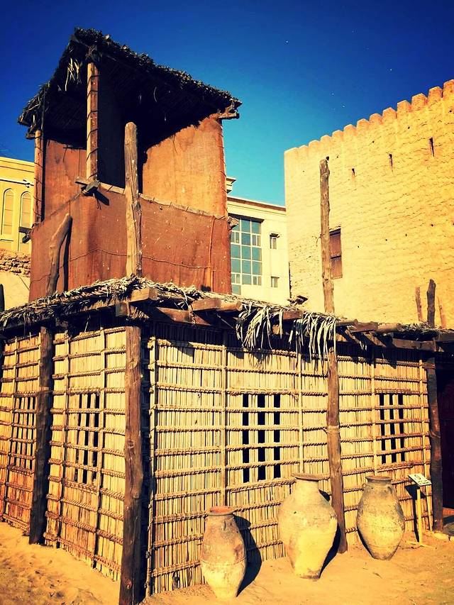 迪拜博物馆的前身曾是皇宫,现在属于是迪拜最古老的建筑物 ,走进大屋,里面复原了当年大屋的陈设。有床铺和厅堂,最令人瞩目的是土空调。高出棚屋的风塔,十字形的街风口,可以引进四面的来风,站下风口下可以体会到阵阵清风。