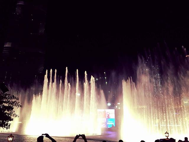 迪拜塔下的人工音乐喷泉演出时间:周六-周四13:00-13:30、18:00-23:00;周五13:30-14:00,每半小时表演一场。有幸能听到张学友的歌曲。