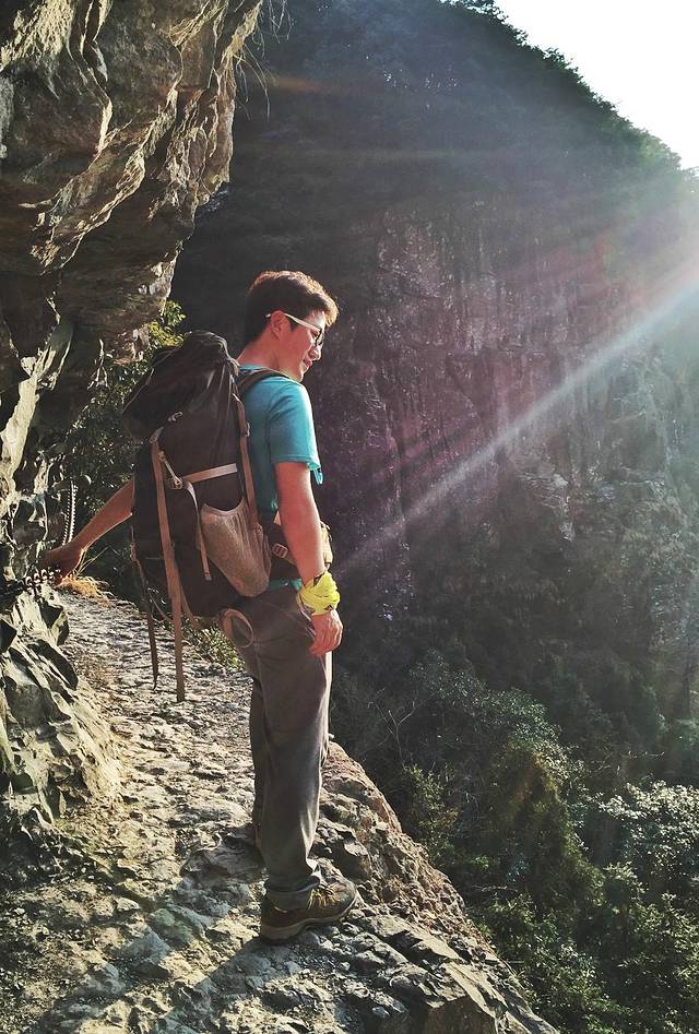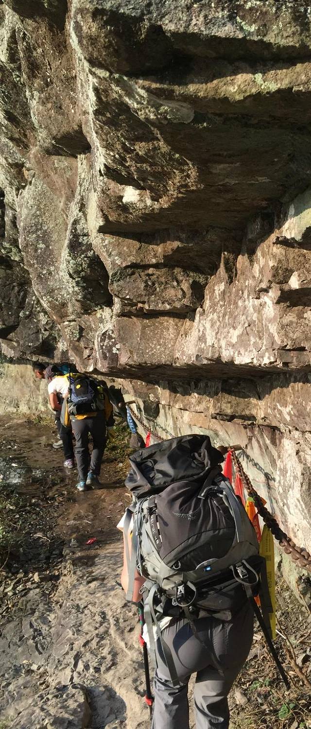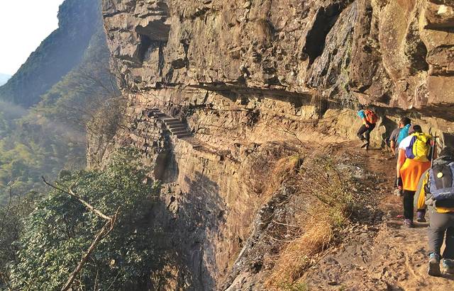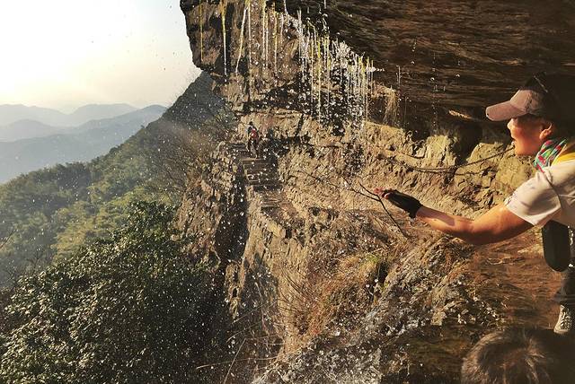 飞鹰道有说是人工开凿的一条徒步道,也有说这石廊是天然形成的,不明所以啊。百米高的崖壁,行走时只能弯腰低头,还有上下几层,都是通过爬木梯子衔接。