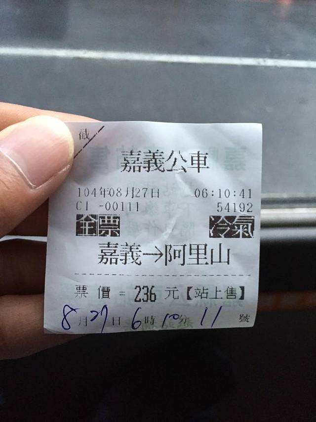 吃好早餐买票去,从嘉义站前往阿里山的巴士,车票236新台币,也可以上车的时候刷悠游卡和一卡通哦,但是因为一卡通没那么多钱了,只好乖乖去买票,所以基本上台湾的两张卡-一卡通和悠游卡用处还是蛮大的,大部分地方多可以使用,充值的时候可以多充一点,能用的地方就刷卡,还可以节约一些费用。