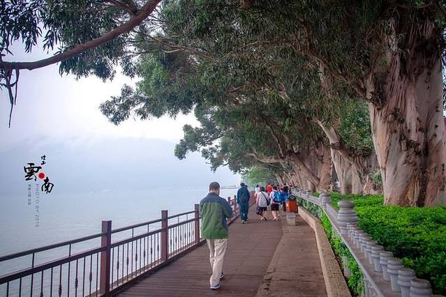 进入公园,你会看到枝体相连的两株百年桉树,一株高大挺拔,一株婀娜多姿,似一对忠贞不渝的爱侣,携手眺望滇池。