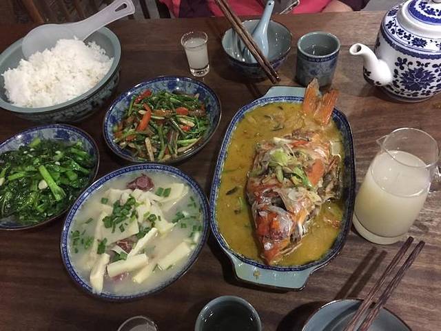 到的比较早,老板给我们的普通标间换成了复式大房,开心死啦,因为楼下一不小心被我弄得有点乱就不放照片啦。问了我一下晚饭怎么吃,老板娘特别热情的告诉我们可以一人50的标准,也可以点菜,基于我们人少,就要50一人的了。离吃饭还有段时间老板娘还推荐我们可以骑自行车是周围小逛一下,重点是车子免费骑哦。我们去附近的章村转了一下,到时天黑了没有看到推荐的板凳桥有点可惜,但回来的晚饭真心赞呢。笋鸭汤、炒青菜、荷包鲤鱼和炒香干,吃的特别开心的我们还格外要了一壶自酿的米酒,还没吃完就有点晕啦。
