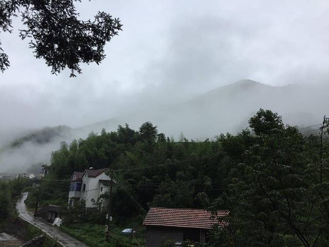 天亮了,天空飘着蒙蒙细雨,倚栏眺望前方,云山雾罩,仙境一般。