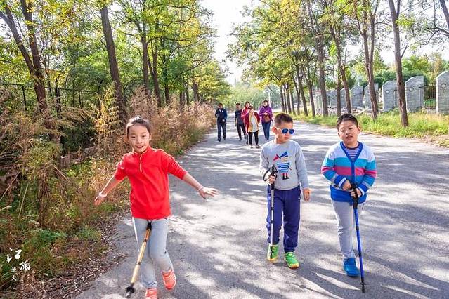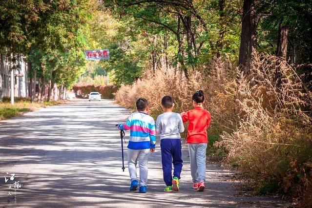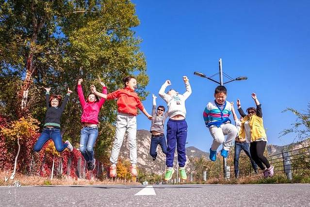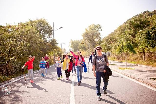 都说秋天爽,阳光艳丽,这真是个好天,大家开开心心地沿着一条没有人的马路前行。