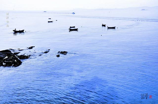 微波浮动,静美露石,远处停留,三五船只。