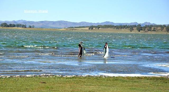 在湖里打渔的人