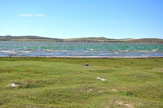 蓝天下的湖水碧绿碧绿的,可惜没能照出湖水的美。