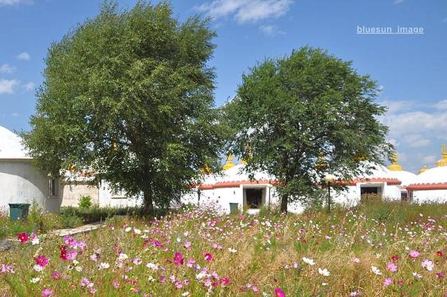 蒙古包外面种满了盛开的波斯菊