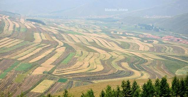 草原天路东段多是蜿蜒陡峭的山路,因此这一段路也是欣赏山坡下大片梯田的最佳地点。
