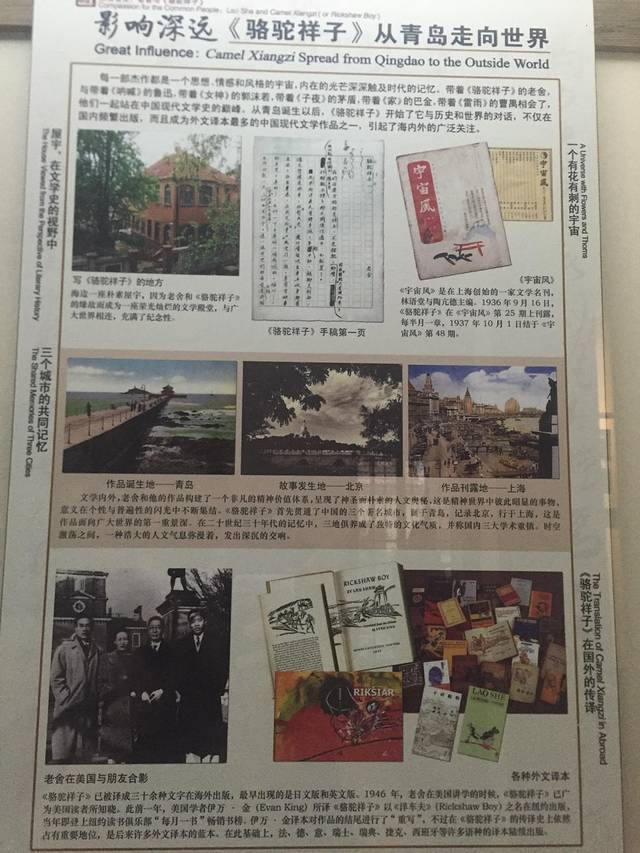 舍故居位于黄县路12号,为临街二层楼房,南向,主体为花岗岩材质。1934年至1937年,老舍先生在青岛生活、工作了3年,这是老舍生活和文学创作的黄金时期。在国立山东大学中文系任教期间创作了著名的长篇小说《骆驼祥子》中篇小说《文博士》、《我这一辈子》等一批优秀作品。参观老舍的故居后也知道了他的《骆驼祥子》在青岛写的北京的生活出书于上海,他还特意跑到青岛的黄包车市场取材,《骆驼祥子》正是从青岛走向的世界。